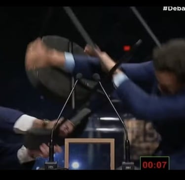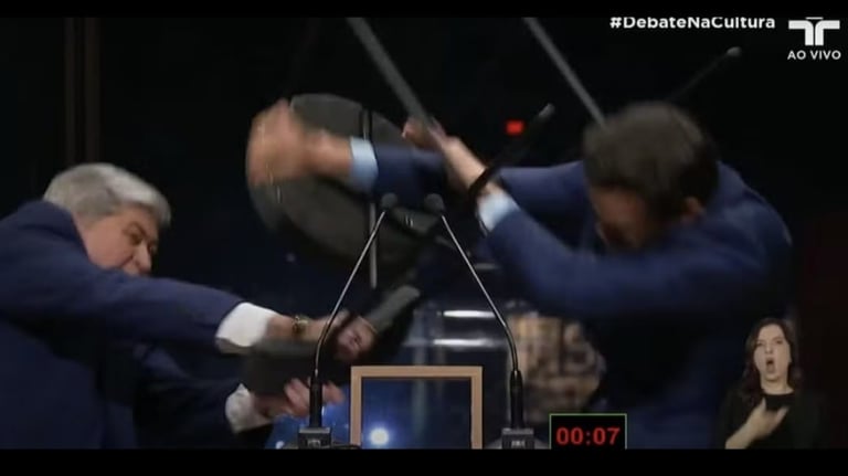 Terminou em cadeirada o debate de prefeitos em São Paulo. Datena acertou uma cadeirada em Pablo Marçal. Ele fraturou a costela e passou a noite no hospital. (Foto reprodução).